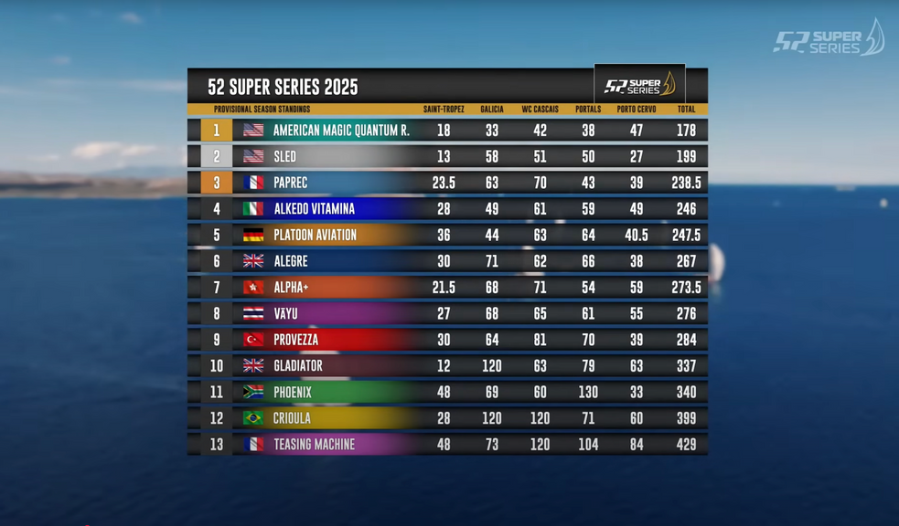 A total of 40 of the 50 scheduled races were contested. Both American Magic and Platoon Aviation scored seven race wins this year compared to six for Sled and Alkedo. Twelve of the 13 teams from ten different countries participating won at least one race, confirming the competitiveness of the most evenly matched fleet in the history of the circuit. Gladiator (winner in Saint-Tropez) and Sled (winner in Sardinia) were the only teams to challenge the dominance of American Magic Quantum Racing, who sign off at the top, as the best team in the history of the 52 SUPER SERIES.